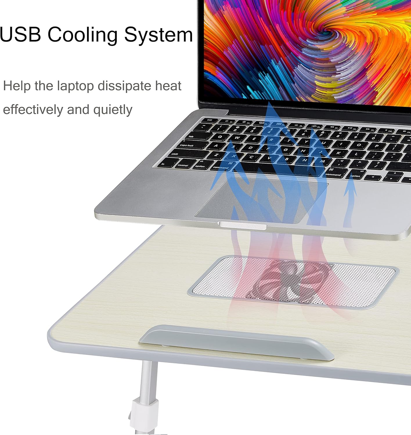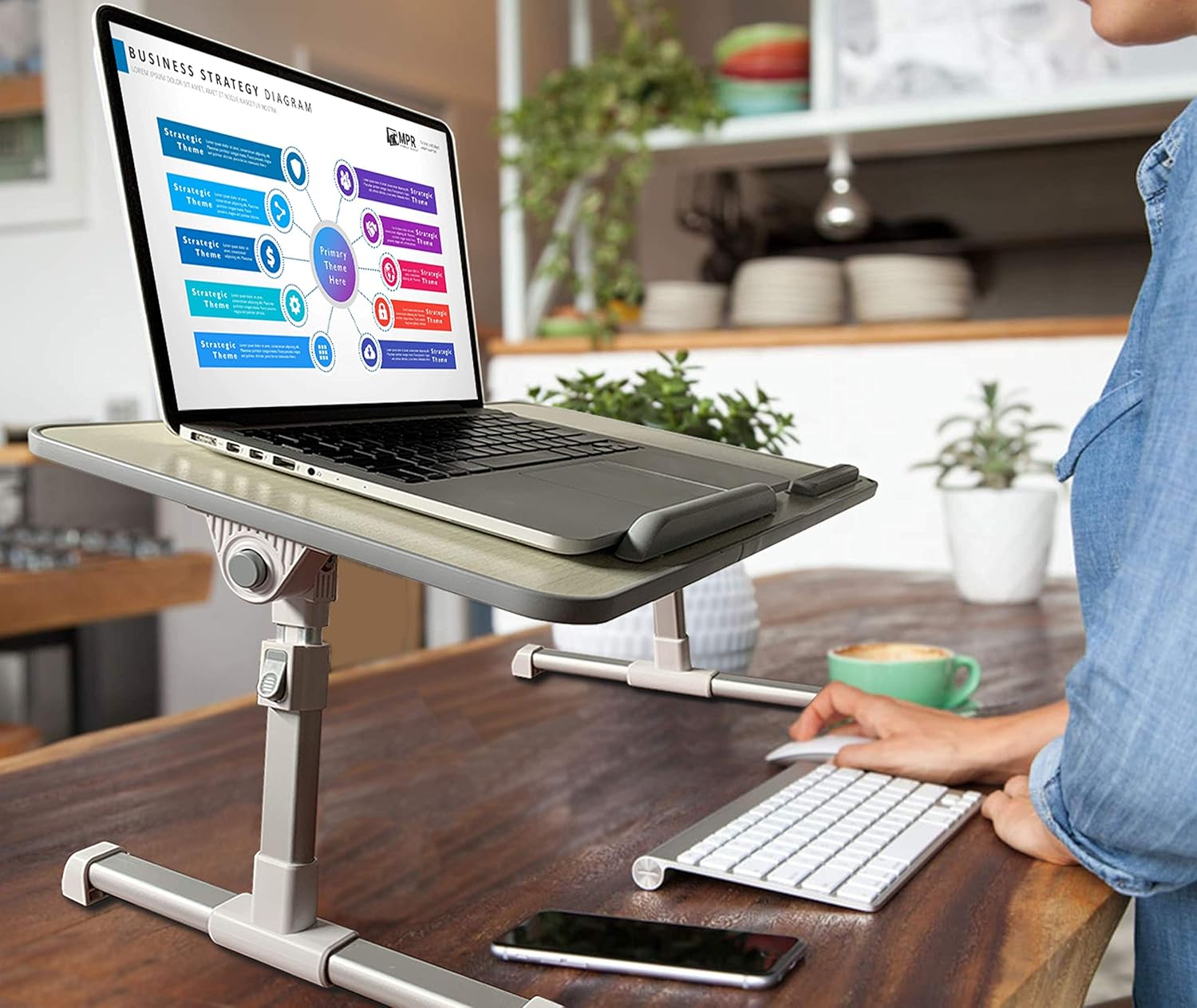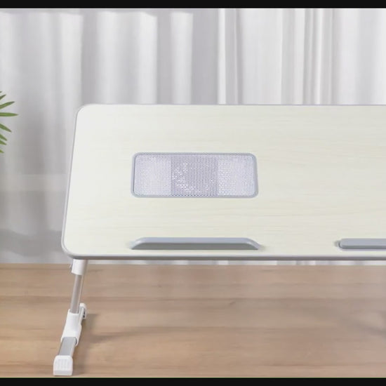 Highly adjustable table for laptops and tablets for healthier and more comfortable postures with built in ventilation fan to keep your device cooler