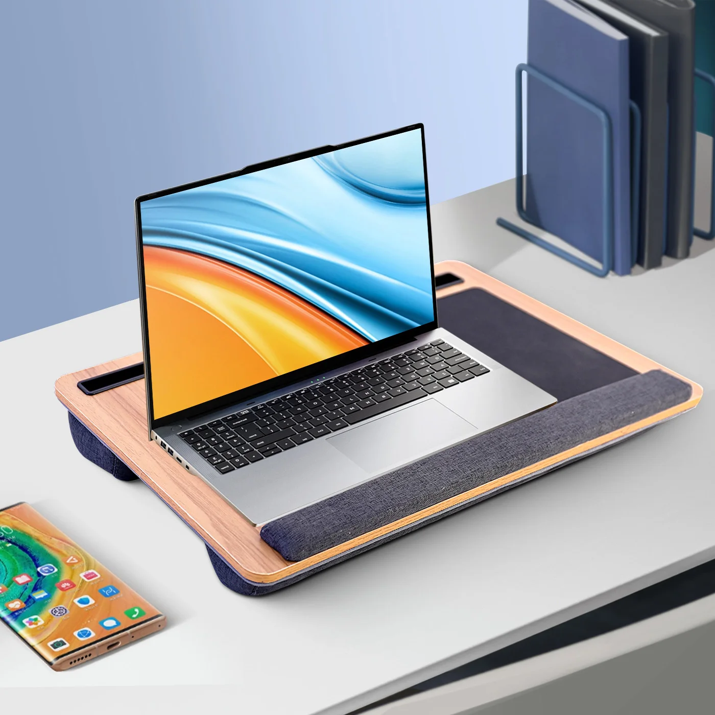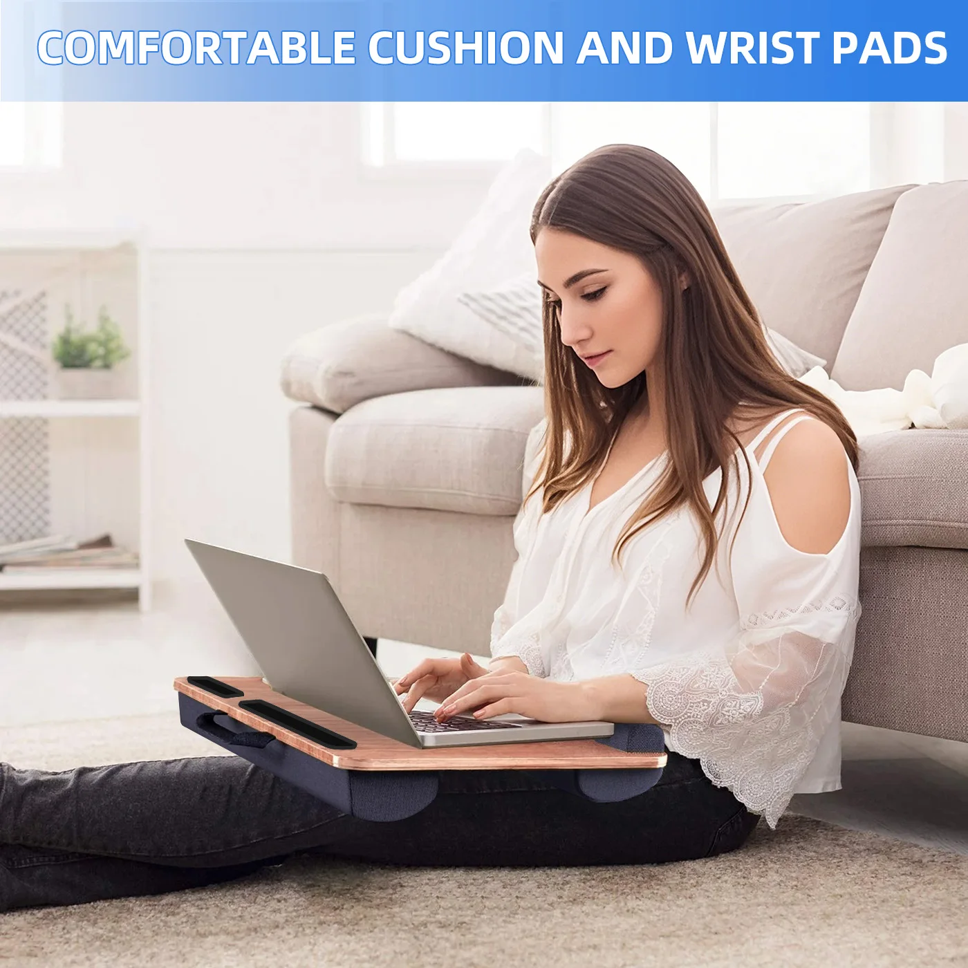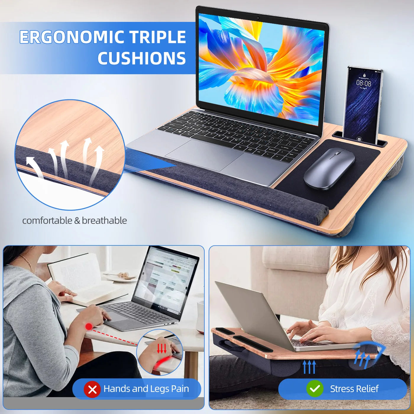 【COMFORTABLE CUSHION & WRIST PAD】 To help you work and learn more efficiently, the lap laptop desk features breathable and skin-friendly memory foam cushion that keeps your legs cool and prevents discomfort caused by overheating laptops. The soft wrist pad provides comfortable support, reducing pressure and strain on your wrists while using a mouse or keyboard.
