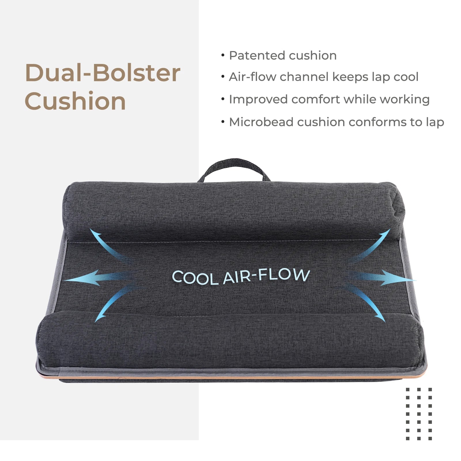 The Boards’ dual-bolster cushions effectively dissipate heat, keeping your lap cool. Lightweight and portable, its reinforced carrying handle makes it ideal for travel.